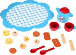 Auf dem praktischen blauen Tablett finden sich ein Kännchen, 2 Tassen mit Löffeln sowie Keksen und Zitrone – alles bereit zum Servieren und Teilen mit Freunden.
