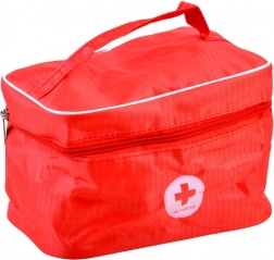 Alles Zubehör findet Platz in der roten Tasche mit Kreuz. Ideal zum Mitnehmen und für schnelle Hilfe überall.