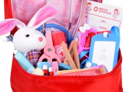 Hinweis: Alle Elemente sind Requisiten. Während des Spiels keine „Medikamente“ oder andere Kleinteile in den Mund stecken. Farbe/Muster des Plüschkaninchens kann variieren.