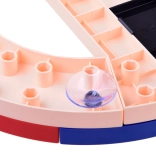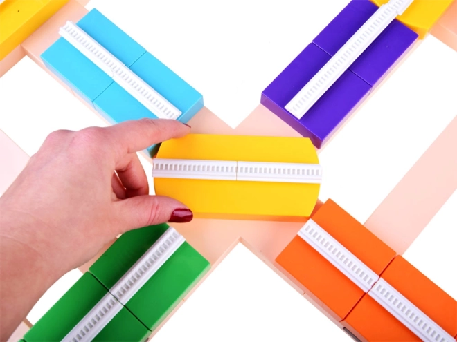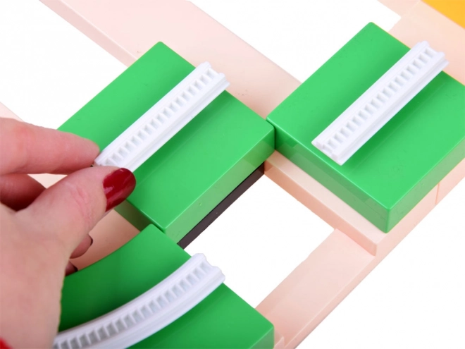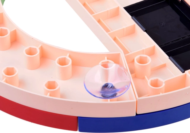 Dank der Saugnäpfe kann die Strecke an glatten, vertikalen Flächen befestigt werden und nach oben wie nach unten verlaufen. Die sichere Führung in den Schienen verhindert ein Entgleisen.