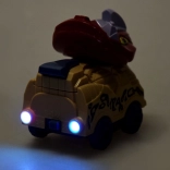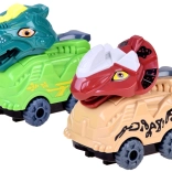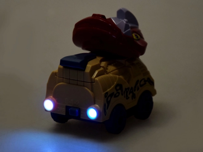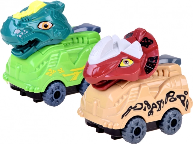 Zwei thematische Autos mit Dinosaurierköpfen leuchten in bunten Farben und bieten zwei Geschwindigkeiten für noch mehr Spaß.