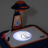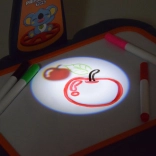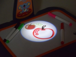 Der Projektor bietet zwei Modi: als Projektor zur Bildanzeige oder als Lampe. Mit einem Schiebeknopf lässt sich die Funktion wechseln. Das Set enthält 48 verschiedene Bilder auf 6 runden Schablonen. Die Motive sind in Kategorien wie Fahrzeuge, Gemüse, Obst, Tiere, Sport und Kleidung unterteilt – für stundenlangen Spaß. Die projizierten Vorlagen können auf der trocken abwischbaren Fläche oder auf normalem Papier nachgezeichnet werden.