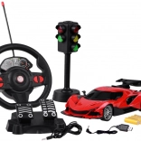 Im Set ist alles für den Spaß enthalten: RC-Auto, Lenkrad, Pedale, Ampel, wiederaufladbarer Akku und USB-Ladekabel.