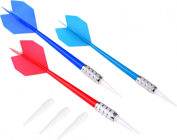 Das Set enthält drei Pfeile mit Metallgriffen und weißen Plastikspitzen, ideal für sichere Indoor-Spiele.