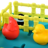 Der Inhalt der Packung umfasst ein Spielbrett, verschiedene Plastikzäune, Tierfiguren wie Kaninchen, Enten und Gänse und ein Anleitungsbuch. Die Materialien sind von hoher Qualität, bunt und angenehm zu berühren.