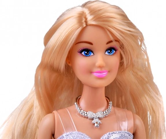 Die Puppe ist in einem eleganten silbernen Rock gekleidet und trägt eine wunderschöne Halskette, was ihren modischen Look unterstreicht.