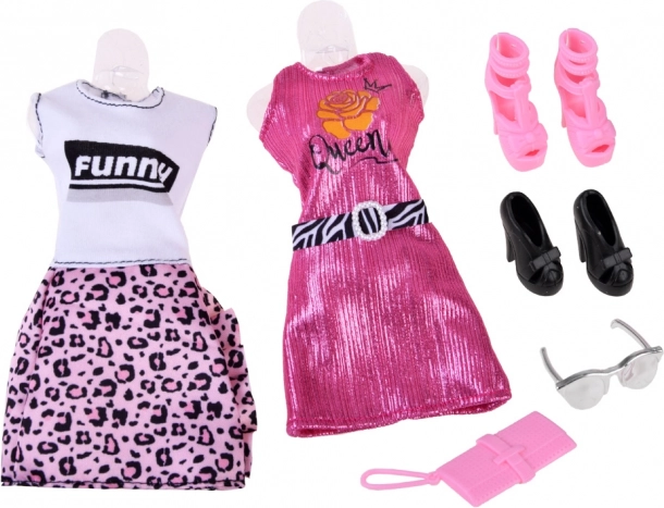 Das Set enthält verschiedene Arten von Kleidung und Accessoires wie ein Leopardenkleid und stilvolle Handtaschen.