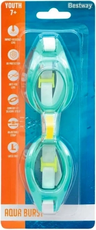 Die Bestway Aqua Burst Kinderschwimmbrille ist ideal für die ersten Schwimmlektionen und den täglichen Wasserspaß. Robuste Polycarbonatgläser schützen die Augen vor Stößen und dank UV-Filter auch vor intensiver Sonne. Die Antibeschlag-Beschichtung sorgt für klare Sicht unter Wasser.