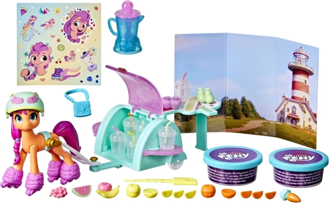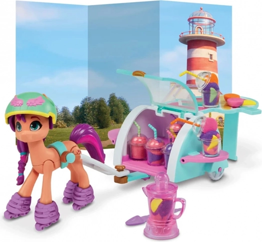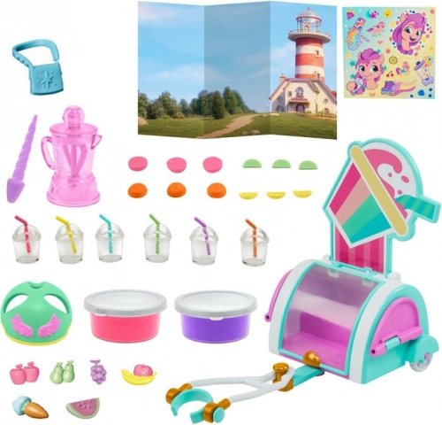 Das Mein kleines Pony Cocktail-Set inspiriert und unterhält Kinder mit schönen Pastellfarben und vielen interessanten Accessoires. Sunny kann mit ihrem mobilen Cocktailwagen reisen und köstliche Fruchtcocktails kreieren. Mit frei beweglichen Rädern und einem Helm zur Sicherheit ist sichergestellt, dass das Spielen nicht nur Spaß macht, sondern auch sicher ist.