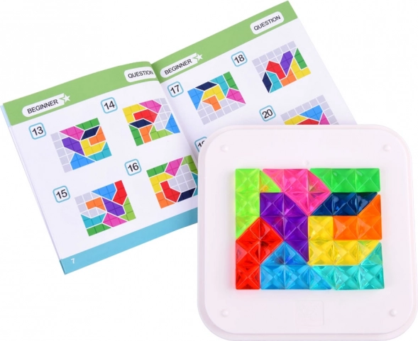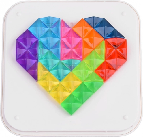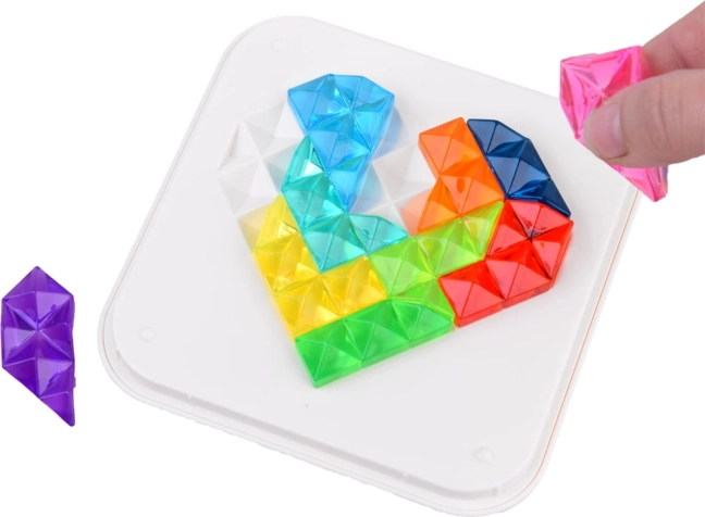 Entdecke unbegrenzte Möglichkeiten des kreativen Schaffens mit diesem einzigartigen Diamantenpuzzle. Das Set enthält 10 farbige Kunststoffstücke, die nach dem beigefügten Buch oder deiner eigenen Fantasie in verschiedene Muster arrangiert werden können. Das Brett hat zwei Seiten – eine mit Herz und die andere mit Quadrat. Alle Teile können nach dem Spielen praktisch in der durchsichtigen Box aufbewahrt werden, was das Aufräumen und Lagern erleichtert.