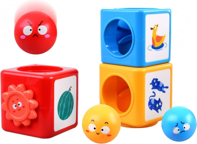 Die farbcodierten Kugeln verschiedener Durchmesser, die aus den Blöcken herausgerollt werden, helfen Kindern, das Konzept der Sortierung zu verstehen.