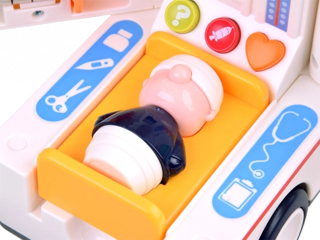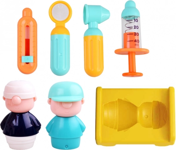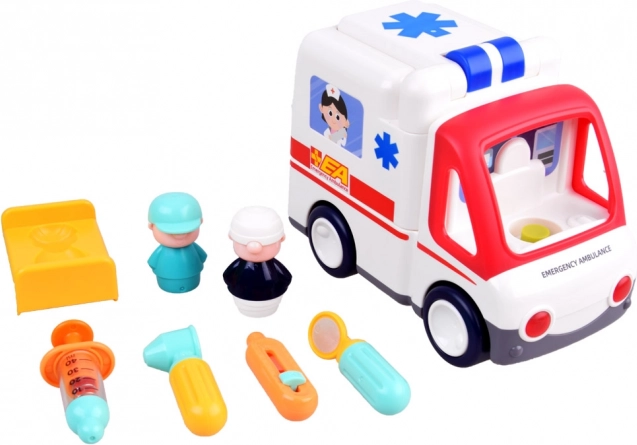 Der Rettungswagen ist mit folgenden Werkzeugen und Ausstattungen versehen: - Thermometer - Ohrspiegel - Laryngologischer Spiegel - Injektionsspritze - Trage - Patientenfigur - Universelle Figur Arzt/Rettungssanitäter/Fahrer