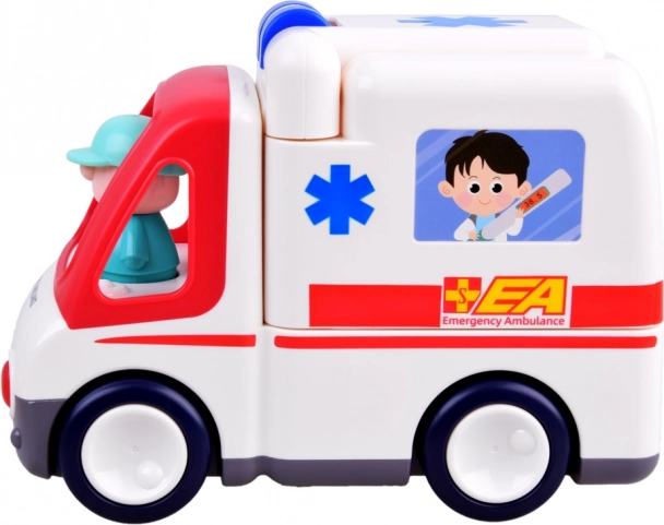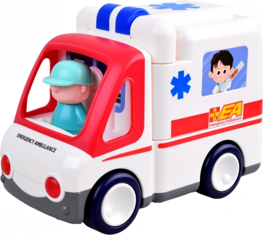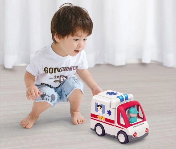 Wichtige Produkteigenschaften: - Selbstständige Fahrt: Das Fahrzeug fährt von allein und ändert die Richtung, wenn es auf ein Hindernis trifft. - Soundeffekte: Startgeräusch des Motors, Sirene des Rettungswagens, Hupe, fröhliche Musik und Bremsgeräusch. Lichteffekte umfassen blinkende Lichter. - Funktioneller Schalter: Unter dem Fahrzeug befindet sich ein Schalter zur Wahl zwischen statischem und beweglichem Modus.