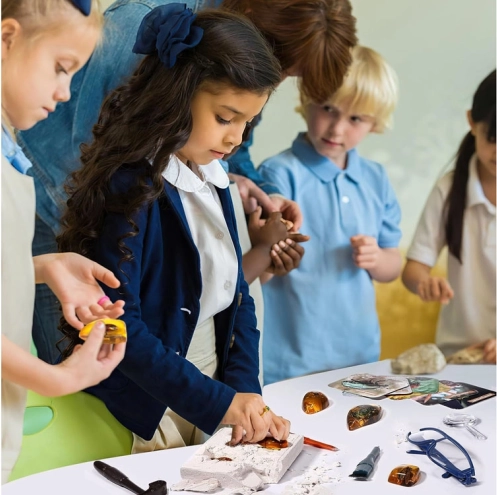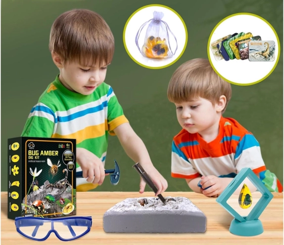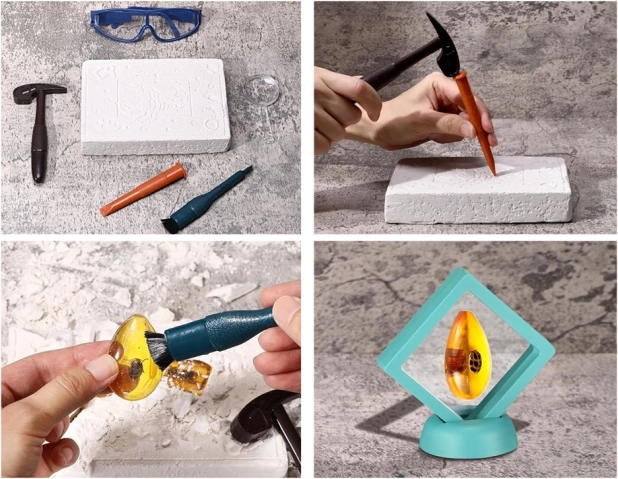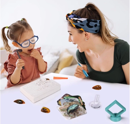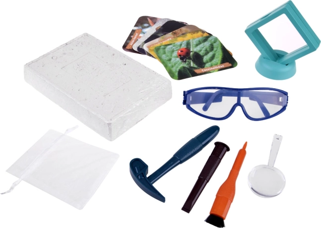 Verwandeln Sie das Kinderzimmer in ein kleines paläontologisches Labor. Im Gipsabguss sind 6 „Bernsteinstücke“ mit eingeschlossenen Insekten verborgen, die das Kind Schritt für Schritt mit Hammer, Meißel und Pinsel freilegt. Für Sicherheit sorgt die Schutzbrille, für detaillierte Untersuchungen dient die Lupe.