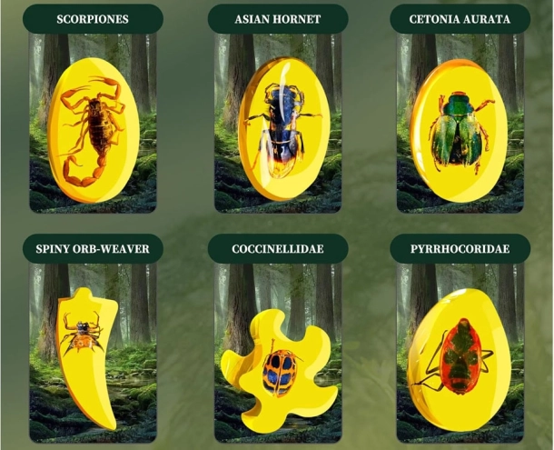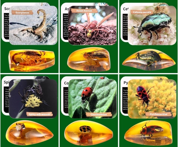 Die gereinigten Funde können im Fossilienbeutel aufbewahrt oder auf dem Präsentationsständer ausgestellt werden. Ebenfalls enthalten sind Informationskarten auf Englisch mit Insektenabbildungen – eine tolle Möglichkeit, Spiel und Grundlagen der Naturkunde sowie Fremdsprachenlernen zu verbinden.