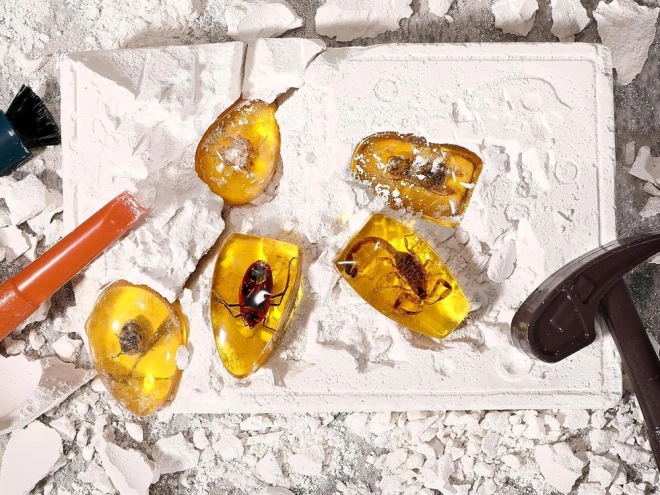 Im Gipsblock sind sechs „Bernsteine“ mit Insekten verborgen. Kinder entdecken sie Schritt für Schritt mit Hammer, Meißel und Pinsel – sicher und mit viel Spaß.