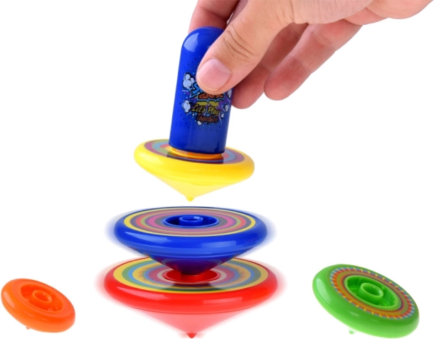 Spielen Sie je nach Alter und Fähigkeiten: Jüngere Kinder können die rotierenden Farben beobachten und das Handling üben, ältere treten zu Wettbewerben an – wer hält den Kreisel länger am Laufen oder wer baut die höchste rotierende Pyramide. Dank der fünf Kreiselgrößen bleibt das Spiel variabel und stets unterhaltsam.