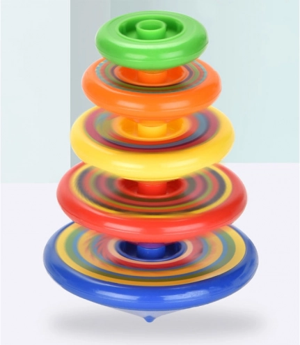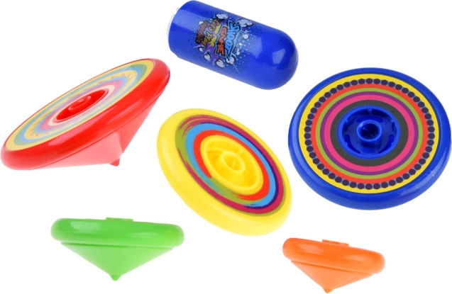 Fünf Kreisel in unterschiedlichen Größen laden zu Wettbewerben um die längste Drehzeit ein und ermöglichen das Bauen einer lustigen rotierenden Pyramide.