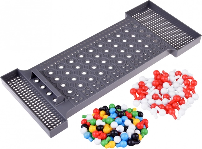 Die graue Kunststofftafel mit Raster und Aufbewahrungsfächern hält die bunten Stifte stets griffbereit und sorgt für Übersicht im Spiel.