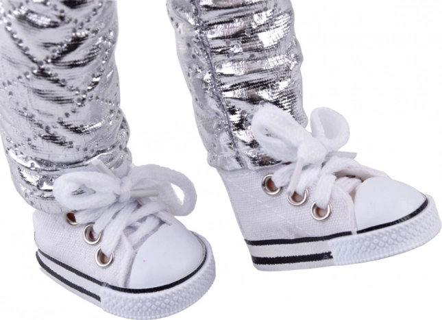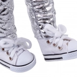 Ein weicher rosa Pelz, Ohrenschützer und silberne Hosen werden von weißen Schnürsneakern ergänzt – ideal für winterliche Abenteuer in der Fantasie.