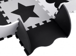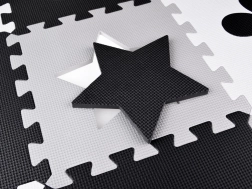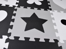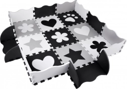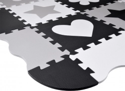 Die Spielmatte aus EVA-Schaum schützt vor Bodenkälte, dämpft Stürze und fördert die Entwicklung der Fein- und Grobmotorik. Das neutrale, kontrastreiche Design mit Herzchen, Sternen und weiteren Formen passt in jedes Kinder- oder Wohnzimmer.