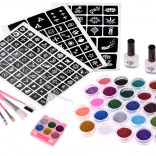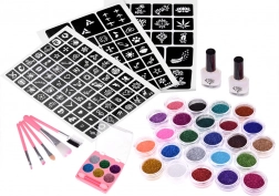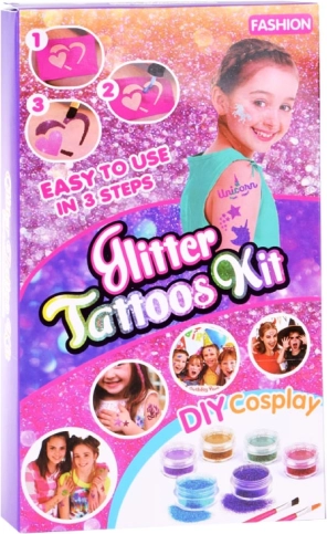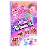 Mit diesem Set für Glitzertattoos können Sie sofort beeindruckende, funkelnde Tattoos gestalten. Es enthält 120 Schablonen in verschiedenen Größen, 24 Döschen mit schönem Glitzer und 2 Fläschchen Kleber – ausreichend für viele Tattoos. Ebenfalls enthalten sind glitzernde Lidschatten und ein Pinselset für ein perfektes Styling.