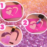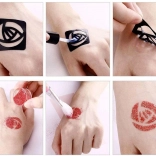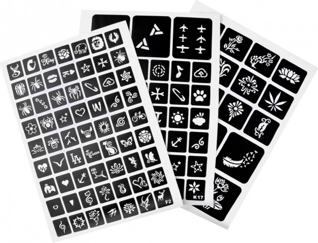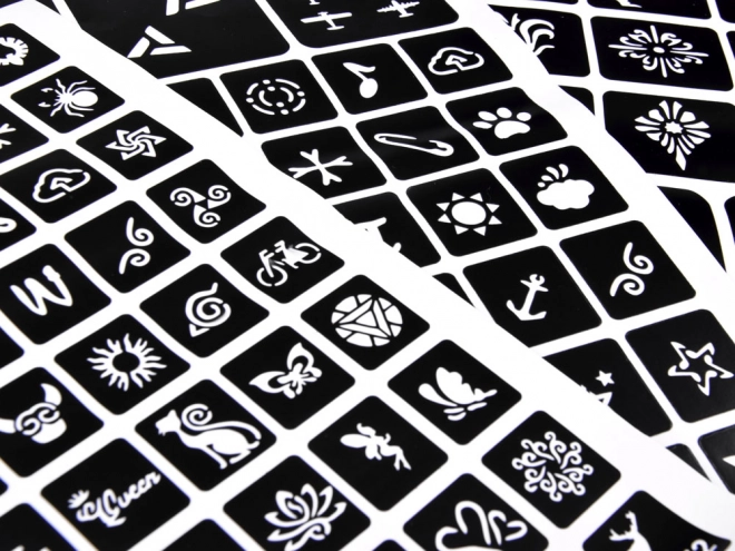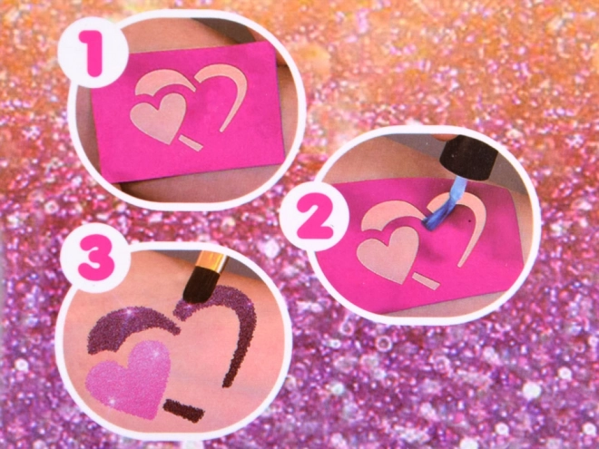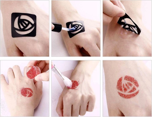 Anleitung: Wählen Sie eine Schablone und kleben Sie sie auf die saubere Haut, tragen Sie das Motiv mit Kleber auf, ziehen Sie die Schablone ab, fügen Sie die Glitzerfarben hinzu – fertig!