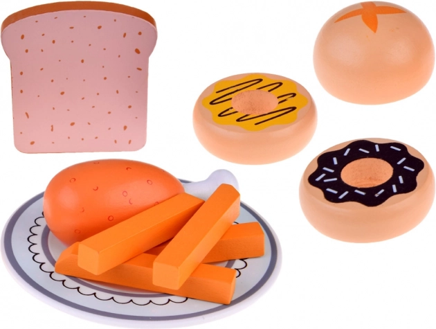 Zum Set gehören ein Porzellanteller sowie buntes Spielzeug wie süße Kekse, Süßkartoffel-Pommes, ein Hähnchenschenkel und ein leckerer Toast. Diese Spielteile unterstützen fantasievolles Spielen und wecken das Interesse der Kinder am Kochen und an kulinarischer Kreativität.