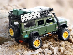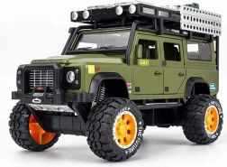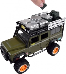 Entdecken Sie den hochwertig verarbeiteten Metall-Geländewagen für jeden kleinen Abenteurer. Der Wagen ist in stilvollem Grün mit sorgfältig gearbeiteten Details wie Dachträger mit Kanister und Kisten.