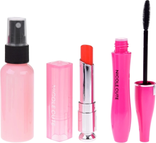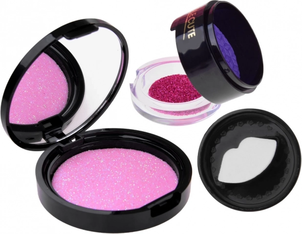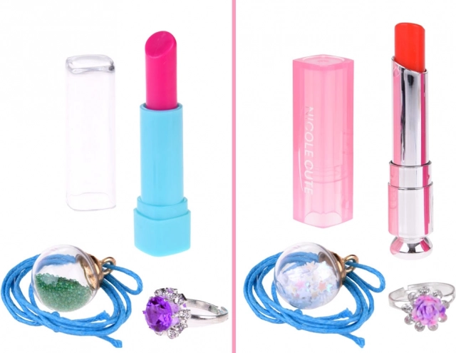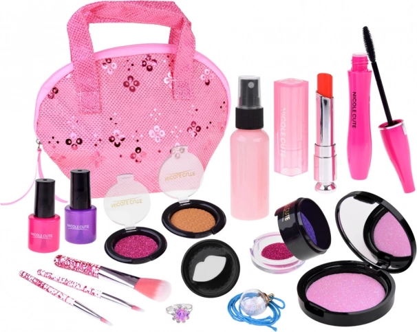 Das Set enthält verschiedene Arten von Schminkartikeln wie Lidschatten, Lippenstifte und Rouge, die ungiftig und für zarte Kinderhaut geeignet sind.