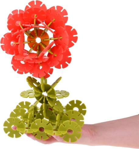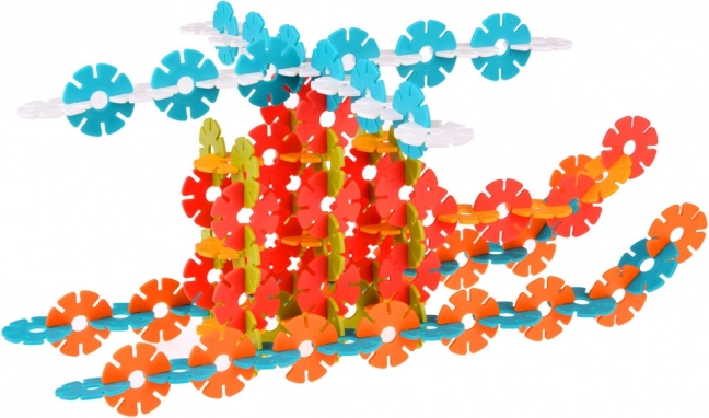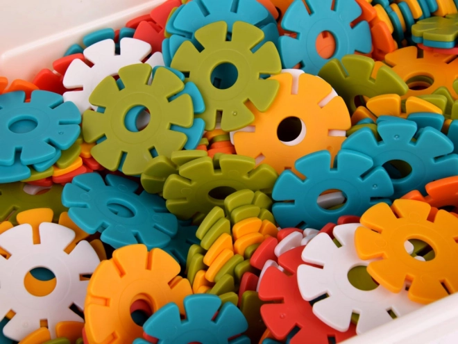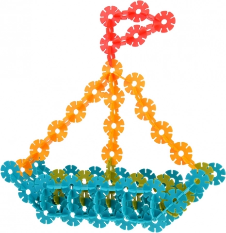 Der Baukasten enthält 506 Teile in 6 verschiedenen Farben: weiß, gelb, orange, rot, grün, blau. Die Bausteine sind in einer Kunststoffbox mit Deckel aufbewahrt, die über einen Griff zum einfachen Transport verfügt. Nach dem Spielen kann das Kind den Baukasten einfach aufräumen.