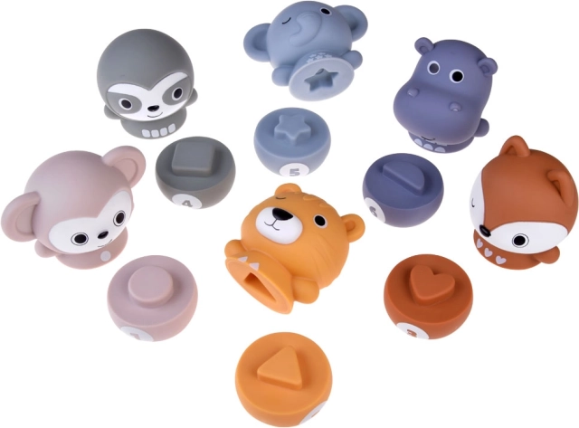 Wählen Sie aus sechs verschiedenen Tierfiguren: Affe, Elefant, Nilpferd, Tiger, Faultier und Eichhörnchen.