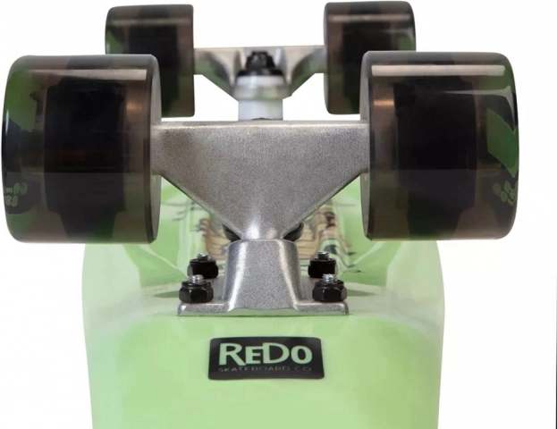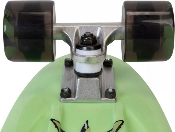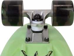 Das Skateboard ist mit schwarzen Rollen und Metall-Trucks ausgestattet, was Stabilität und eine ruhige Fahrt gewährleistet.