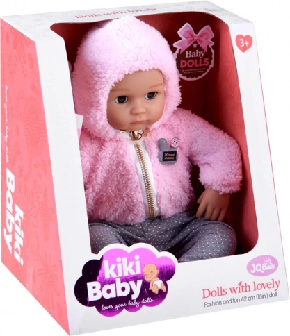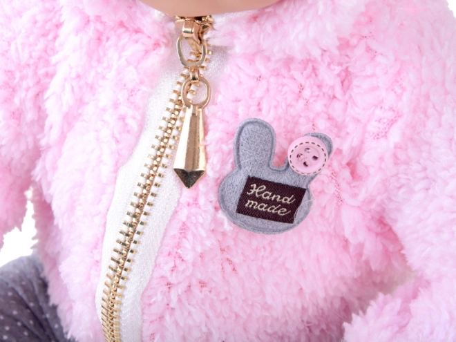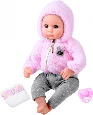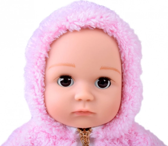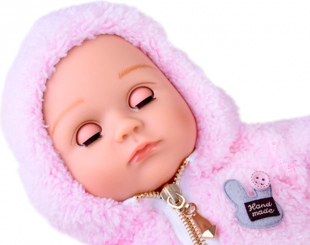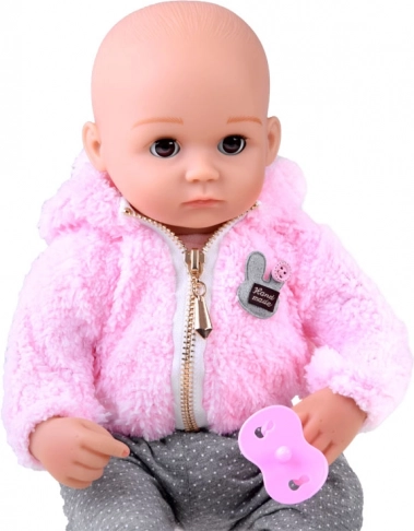 Die Puppe sieht wie ein Neugeborenes aus. Sie hat einen weichen Stoffkörper sowie Kopf, Arme und Beine aus hartem Gummi. Wenn man die Puppe hinlegt, schließen sich ihre Augen. Wie ein echtes Baby hat sie keine Haare auf dem Kopf, aber für den Winter wird sie durch ein warmes, angenehmes rosa Kapuzenoberteil geschützt. Das Outfit wird durch stylische graue Leggings mit Punkten ergänzt.