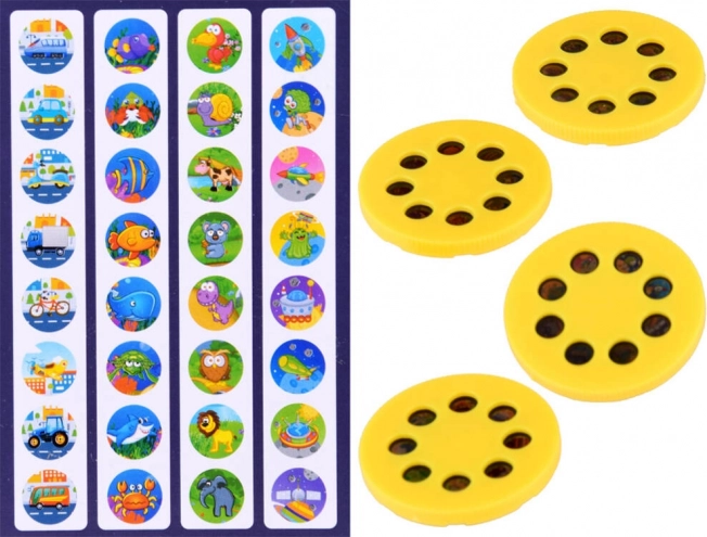 Enthalten sind 8 farbige Filzstifte, 4 Motivscheiben (Weltraum, Tiere, Fahrzeuge, Unterwasserwelt), ein Vorrat an Papier und eine stabile Zeichenfläche – mehr braucht es nicht.