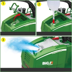 Das größte Highlight ist die realistische Rauchfunktion – einfach Wasser aus der beiliegenden Flasche nachfüllen, den Rauch über die Fernsteuerung aktivieren und aus dem Auspuff steigt feiner, beleuchteter Dampf auf. Das bewegliche Schneidwerk besitzt einen rotierenden Einzug, lässt sich heben und senken, der Ausleger dreht sich um 360°. Die Hinterachse ist angetrieben und ermöglicht eine Spurverstellung. Breite Gummiräder sorgen für Stabilität und Traktion.
