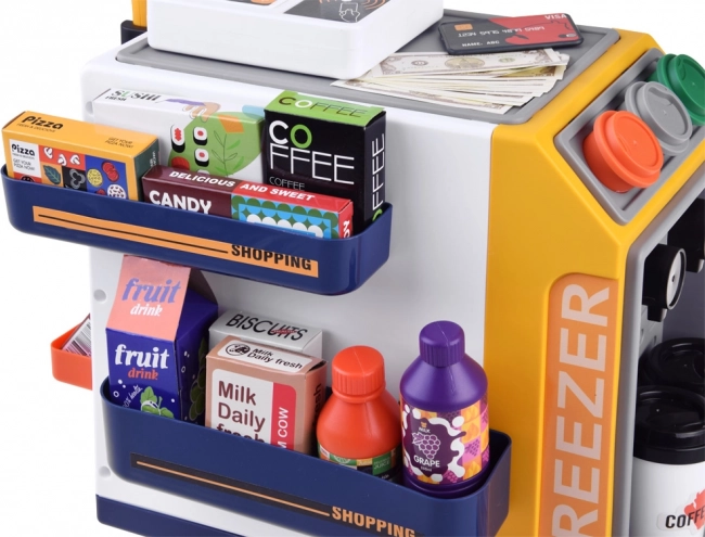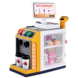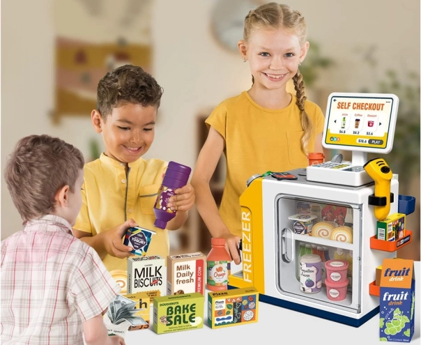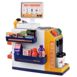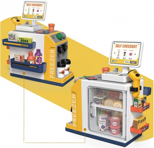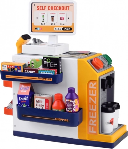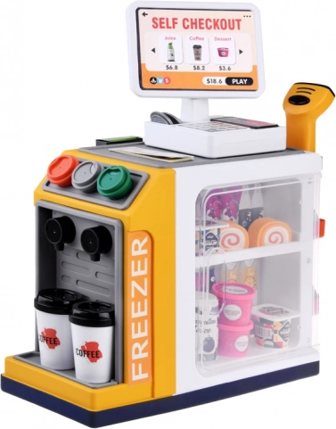 Diese realistische Selbstbedienungs-Kasse mit Kaffee-Ecke verwandelt das Kinderzimmer in einen kleinen Supermarkt. Kinder probieren die Bedienung von Kunden, die Zubereitung von Kaffee, das Scannen von Waren und das Bezahlen mit Karte oder „bar“ aus. Integriertes Gefrierfach/Kühlfach für Desserts und Getränke, farbige Tasten und Display sorgen für ein authentisches Erlebnis.