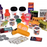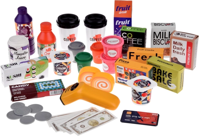 Das Set enthält 46 sorgfältig gestaltete Elemente: eine Kasse mit Sound, einen Scanner mit Licht, Kartenleser, Kaffeebecher und Espressobecher, Getränke-Attrappen, Joghurts, Eiscreme sowie Pappschachteln (Milch, Kekse, Kaffee, Sushi, Pizza u. a.) ebenso wie Geldscheine, Münzen und eine Kreditkarte. So werden Kommunikation, Feinmotorik und Finanzkompetenz gefördert.
