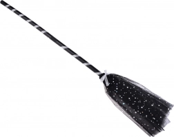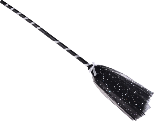 Faltbarer Besen mit schwarz-weißem Spiraldesign und dekorativen Fransen verleiht dem Kostüm eine verspielte Note.