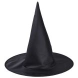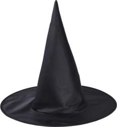 Traditioneller schwarzer Hexenhut mit hoher Spitze und breiter Krempe vervollständigt das authentische Kostüm.