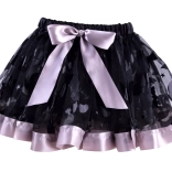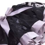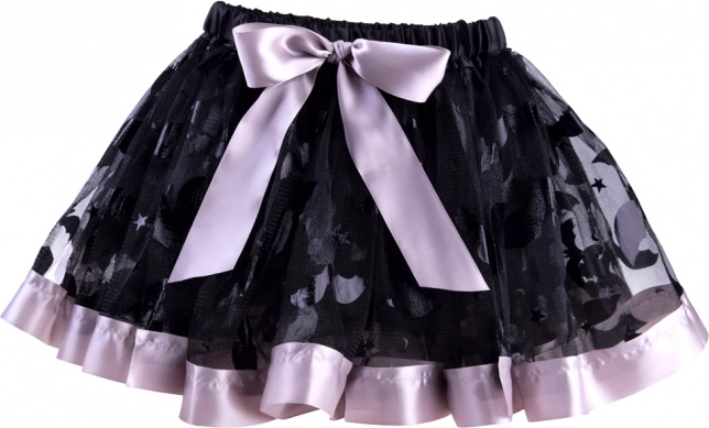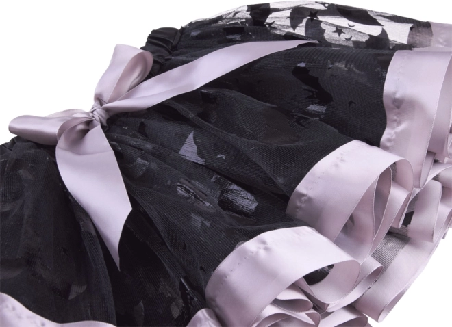 Schwarzer Netzrock mit dekorativen Mustern, violetter Paspel und Schleife. Der elastische Bund sorgt für Komfort und einfaches Anziehen.