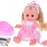 Die Puppe trägt ein schönes weißes und rosa Kleid mit Blumenmuster und ein weißes T-Shirt. Sie ist mit einer Pinkel-Funktion ausgestattet, die es Kindern ermöglicht, die Babybetreuung zu lernen. Sie bietet ein realistisches Gefühl dank der festen Gummi-Kopf, -Hände und -Beine.