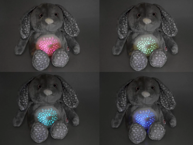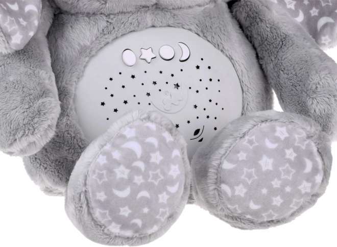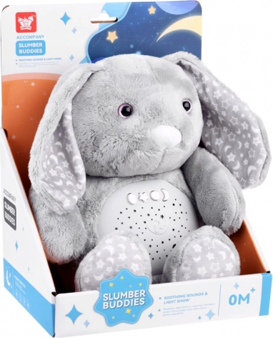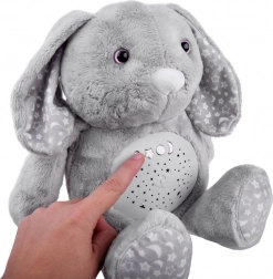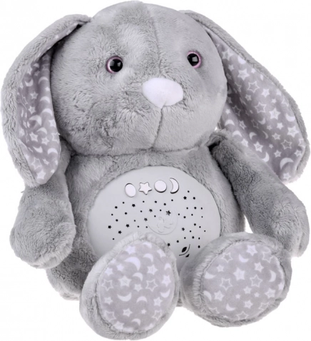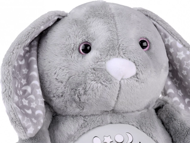 Dieser weiche Plüschhase ist aus einem feinen Material in gedämpftem Grau gefertigt und mit Sternen- und Mondmustern auf den Ohren und Füßen verziert. Die Augen sind aus Kunststoff, während die Nase gestickt ist, was dem Spielzeug ein niedliches Aussehen verleiht. Dank des interaktiven Panels im Bauch des Hasen wird er zu einem unverzichtbaren Begleiter für Kinder, die Schwierigkeiten haben, alleine einzuschlafen.