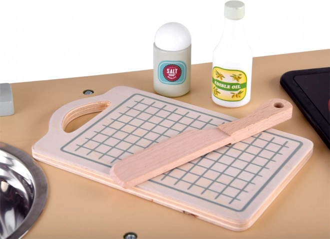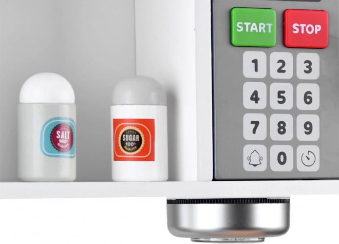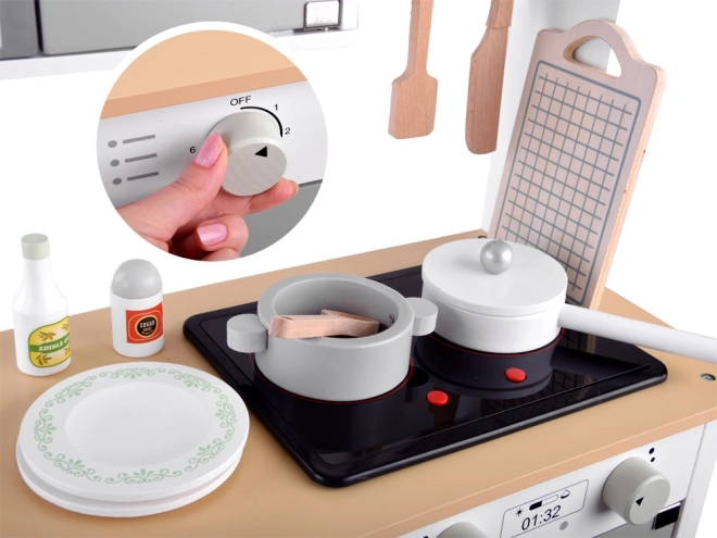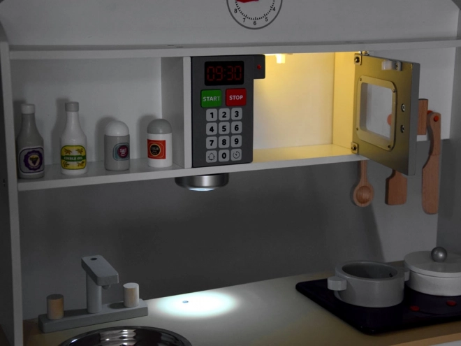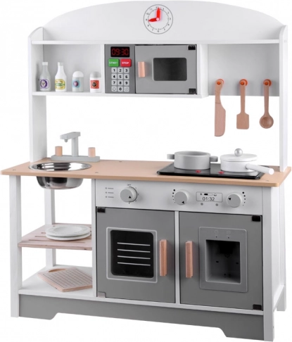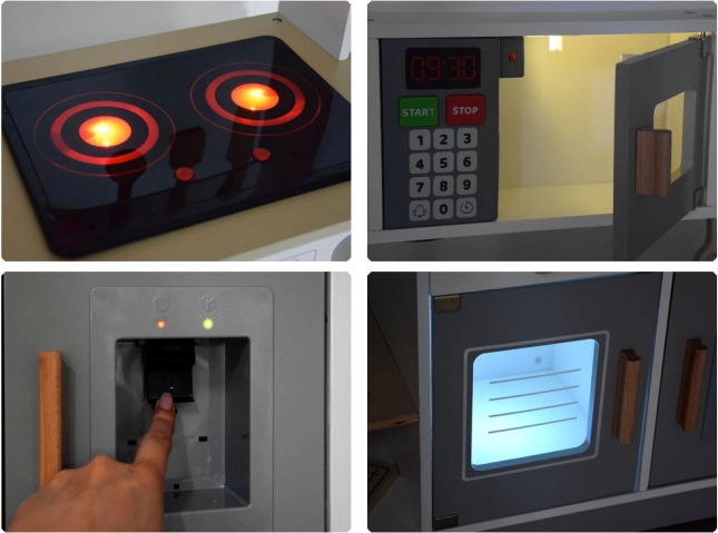 Diese Kinderküche ist ästhetisch gestaltet, bietet nicht nur großartigen Spaß, sondern trägt auch zur Entwicklung des Kindes bei. Kinder lieben es, Erwachsene zu imitieren, und diese Küche ermöglicht es ihnen, Koch-, Aufräum- und andere haushaltsbezogene Aktivitäten zu spielen.