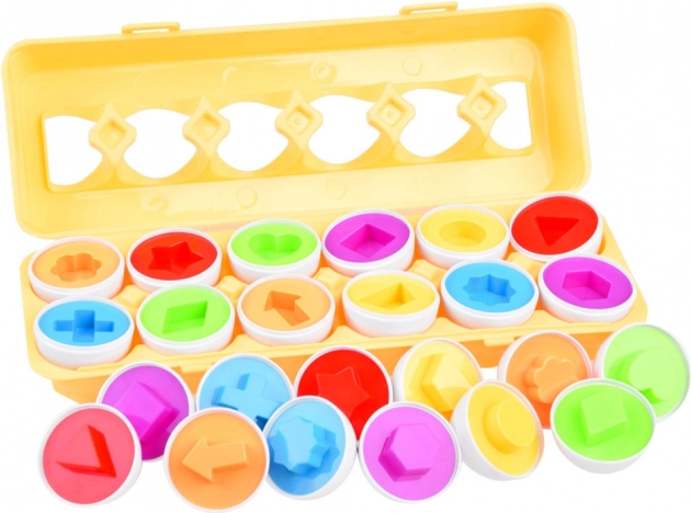 Dieses durchdachte Set enthält 12 weiße Eier, die in einem gelben Kunststoff-Tablett verstaut sind. Im Inneren finden Kinder verschiedenfarbige Hälften mit Formen, die nach Farbe und Form richtig zugeordnet werden müssen (z. B. Stern, Herz, Kreis, Quadrat und weitere). Das Spiel fördert die frühe Kompetenzentwicklung, lehrt Geduld und Konzentration.