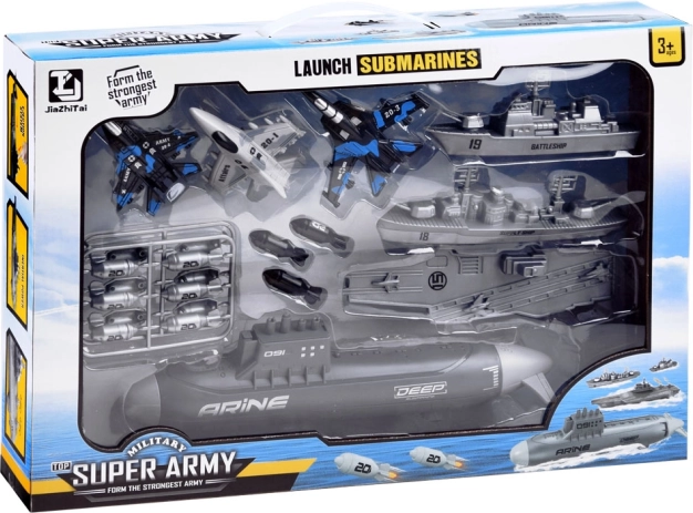 Dieses umfassende Set militärischer Technik eröffnet Kindern die Welt maritimer Operationen und Luftunterstützung. Durch die Kombination aus U‑Boot, Schiffen und Jagdflugzeugen können eigene Szenarien entstehen, Strategien geplant und die Fantasie gefördert werden. Realistische Formen, dezente Farben und Aufdrucke verstärken die Atmosphäre der Seeschlacht.