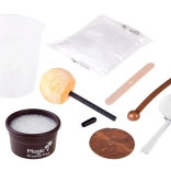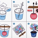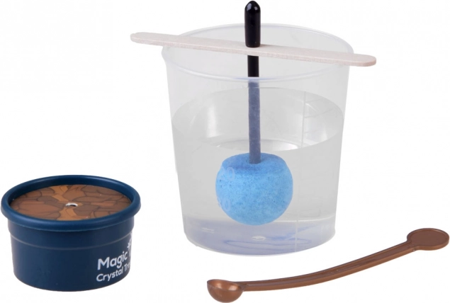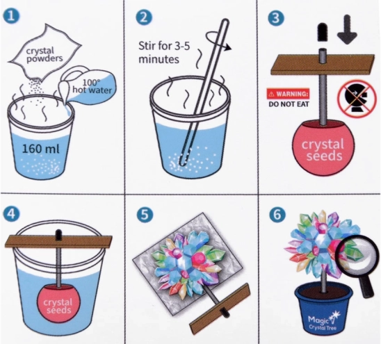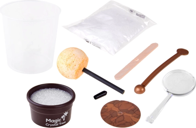 Im Set ist alles Nötige enthalten: 200-ml-Messbecher, Beutel mit Kristallpulver/Sand, farbiger Kristallkeim an Stäbchen, Rührstab, Lupe für detailreiche Beobachtungen, Holzplättchen, Halterung und ein kleines Blumentöpfchen (Sockel). Das Vorgehen ist einfach und sicher – befolgen Sie die Anleitung und arbeiten Sie mit heißem Wasser unter Aufsicht eines Erwachsenen.