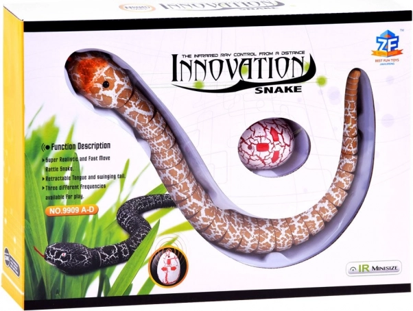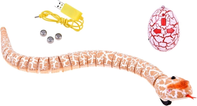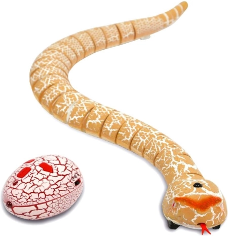 Die ferngesteuerte Schlange imitiert die Bewegungen eines echten Reptils – sie schlängelt sich, streckt die Zunge heraus und bewegt den Schwanz, wodurch sie sehr glaubwürdig wirkt. Der eiförmige Controller ist intuitiv und liegt dank der kompakten Größe auch kleineren Kindern gut in der Hand.