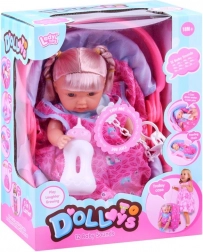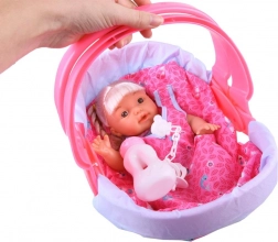 Zum Set gehört eine süße Puppe, ein Fläschchen, ein Schnuller an einer Kette und eine Trage.