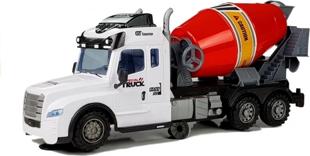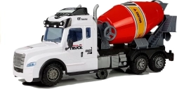 .Ferngesteuertes Baufahrzeug für Kinder ist mit profilierten Kunststoffrädern ausgestattet, die das Spielen auf verschiedenen Oberflächen ermöglichen. Der weiße Betonmischer mit roter Trommel ist mit kontrastierenden schwarzen Details sowie auffälligen Aufklebern verziert.